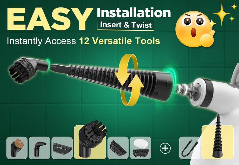 - 12-pieces Accessories Set- This home steam cleaner comes with exclusive free 12 pieces accessory kit, Includes 4 round brushes and other attachments to meet your different needs. Our all-in-one steamer can deep clean for your home.